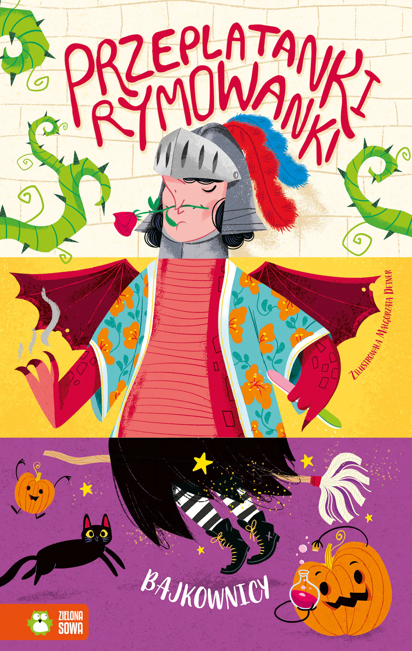 Książka zachęca do czytania rymowanych tekstów i tworzenia własnych opowieści. Możecie wspólnie z dzieckiem łączyć różne części historii, aby stworzyć jeszcze bardziej zabawną rymowankę. Gdy rycerzowi przytrafią się smocze skrzydła, a czarownica zyska syreni ogon, cieszcie się wspólnie swoją kreatywnością!